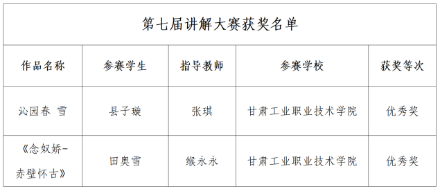 7月2日,甘肃省教育厅公示了“典耀中华,赓续文脉”第七届中华经典诵写讲大赛省级初赛拟获奖名单,我校在“诵读大赛”“讲解大赛”“篆刻大赛”中共斩获三等奖2项,优秀奖4项。