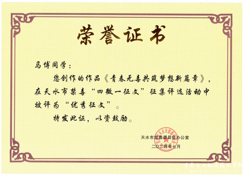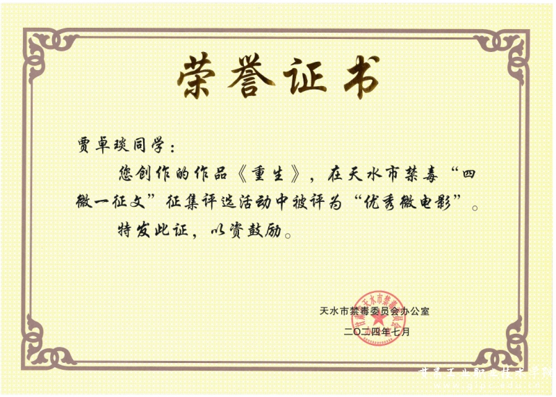 近日,在甘肃省禁毒“四微一征文”活动中,我校学生贾卓琰创作的微电影作品《重生》和学生马博的原创征文作品《青春无毒共筑梦想新篇章》被天水市禁毒办评选为优秀作品,同时,微电影作品《重生》被甘肃省禁毒办评为优秀作品。