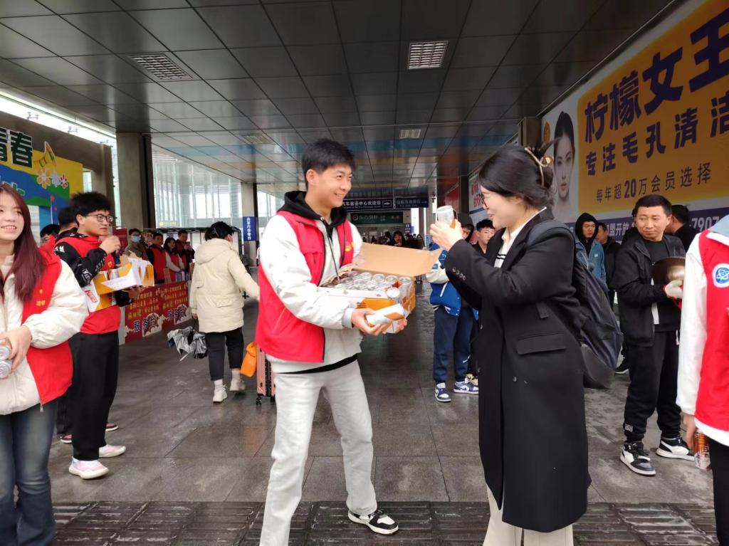 在人潮涌动的天水南站,我校测绘学院的志愿者们热情的为外地游客引导乘车路线、乘车方式,介绍天水旅游景点,温馨的为外地游客免费提供特产饮品。雨中虽辛苦,但累的有价,换来的是游客们为同学们热情服务的点赞!他们这样说:“天水的同学是真的热情,还没有吃上麻辣烫就已经感受到了”。