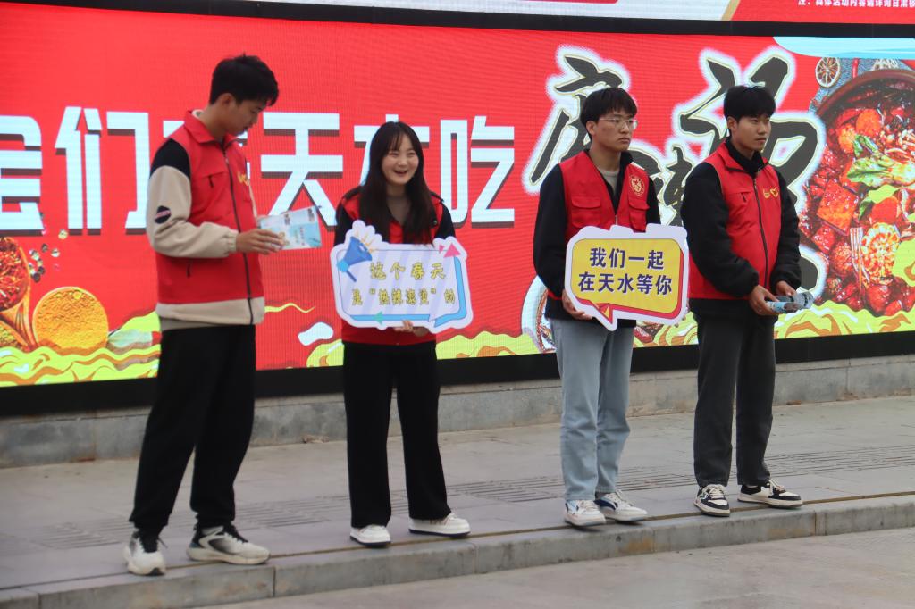 面对每天巨大的客流量,我校团委立即响应上级团委的指示,积极号召工院学子,化身一抹“志愿红”,投身到助力天水麻辣烫的志愿服务工作中。校团委对学生进行了上岗志愿服务前的安全与注意事项培训,明确志愿者职责所在,确保志愿服务衔接顺畅。身着工院志愿红的青年志愿者被分布在人流密集的高铁南站、吸引大量游客的网红麻辣烫店等区域前,做好现场秩序维护,耐心周到地为游客和市民朋友提供路线引导、讲解指引、交通疏导等,用青春热情展现工院一抹志愿红,用实际行动弘扬青年志愿者之志。