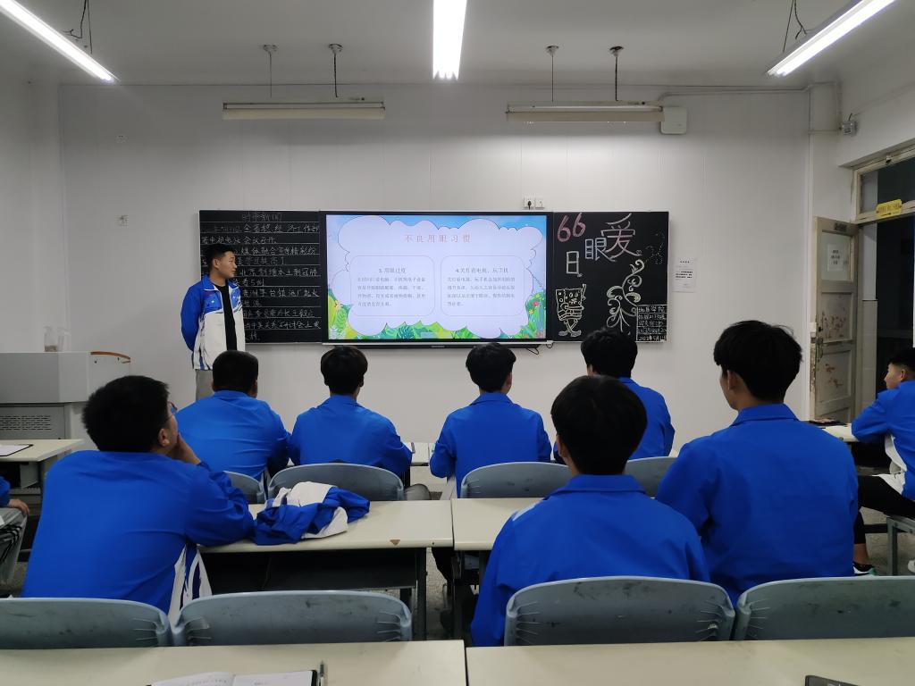 各班团支书以PPT演讲的形式开展了本次主题团课,细心全面地为同学们讲解爱眼护眼的重要性以及正确用眼的方式方法,引导学生爱眼、护眼,养成良好的用眼习惯。争取做到每天校内、校外各1小时体育活动,强身健体防近视。