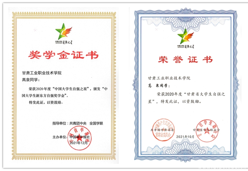 近日,由共青团中央、全国学联指导,中国青年报社、新东方教育科技集团联合开展的2020年度“中国大学生自强之星”寻访活动评审结果揭晓。经学校推荐、省级初评、全国评审等环节,我校旅游学院高泉同学获评2020年度“中国大学生自强之星”及“甘肃省大学生自强之星”荣誉称号,电信学院张强同学获评2020年度“甘肃省大学生自强之星”荣誉称号。