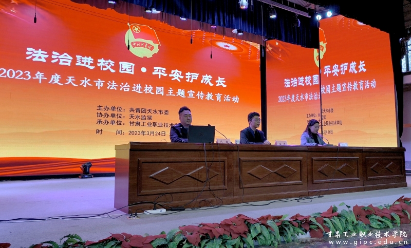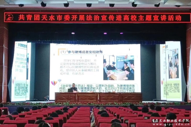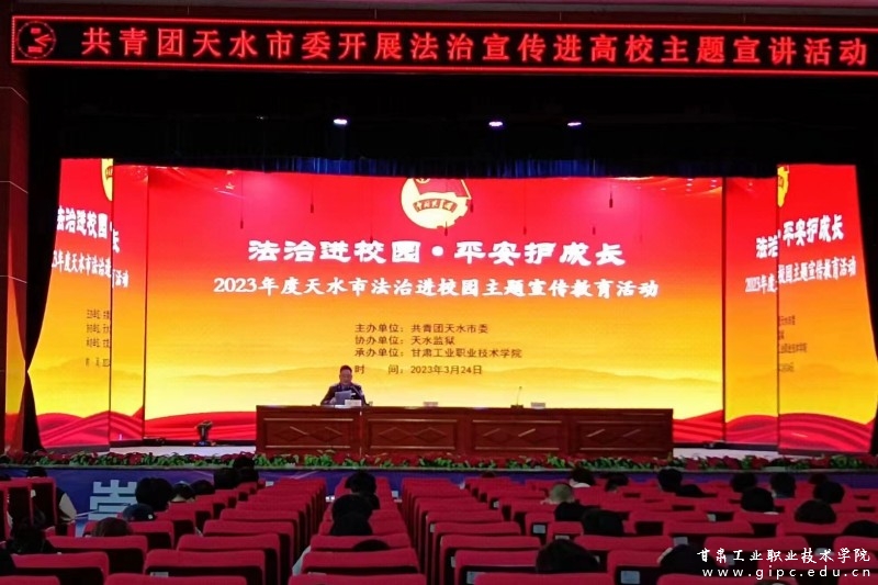 为深入学习贯彻习近平法治思想,贯彻落实社会稳定和长治久安总目标,抓好青年思想状态,切实做好青年学生的思想引领工作,3月24日,由共青团天水市委主办,我校团委、保卫处、学工处、宣传部联合承办的“法治进校园·平安护成长”2023年度天水市法治进校园主题宣传教育活动在我校大学生活动中心举办。共青团天水市委副书记温浩出席,特邀天水监狱一监区副监区长、三级警长陈超主讲。各二级学院学生干部及学生代表、学校基建后勤务工人员代表参加宣讲会。