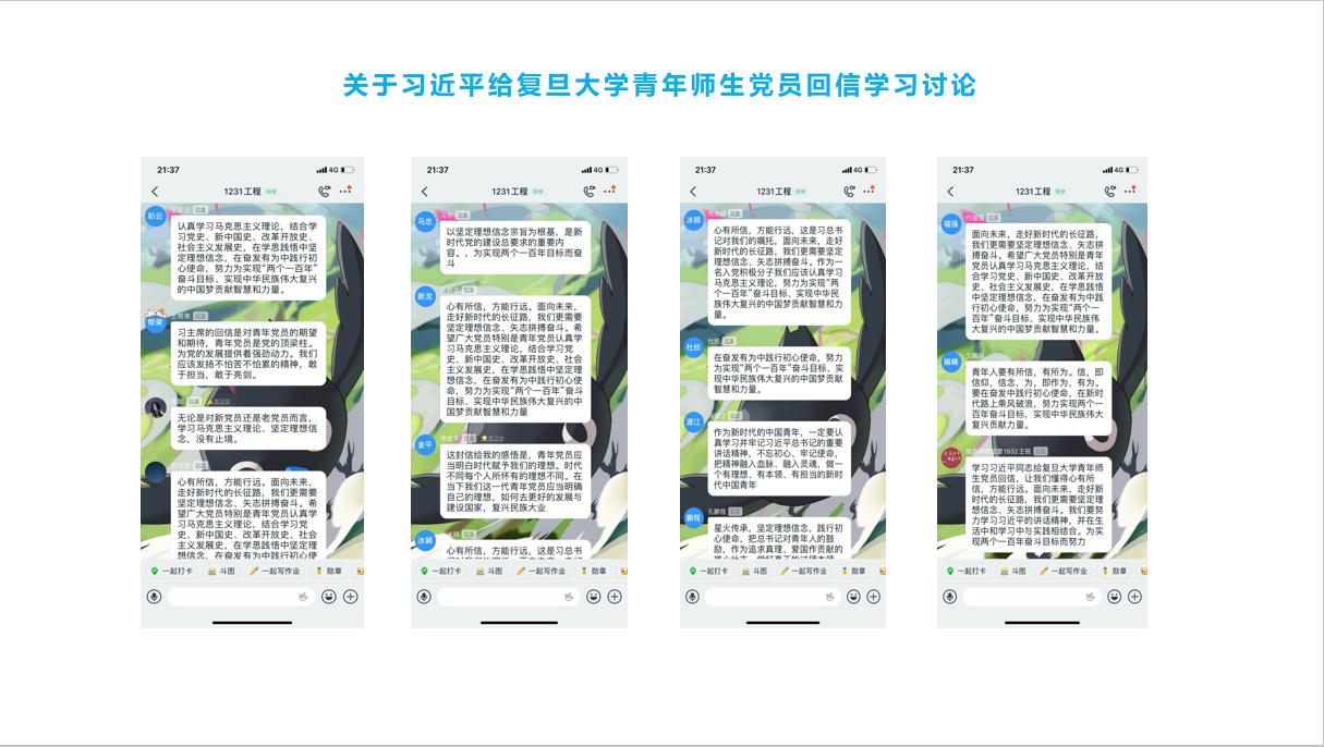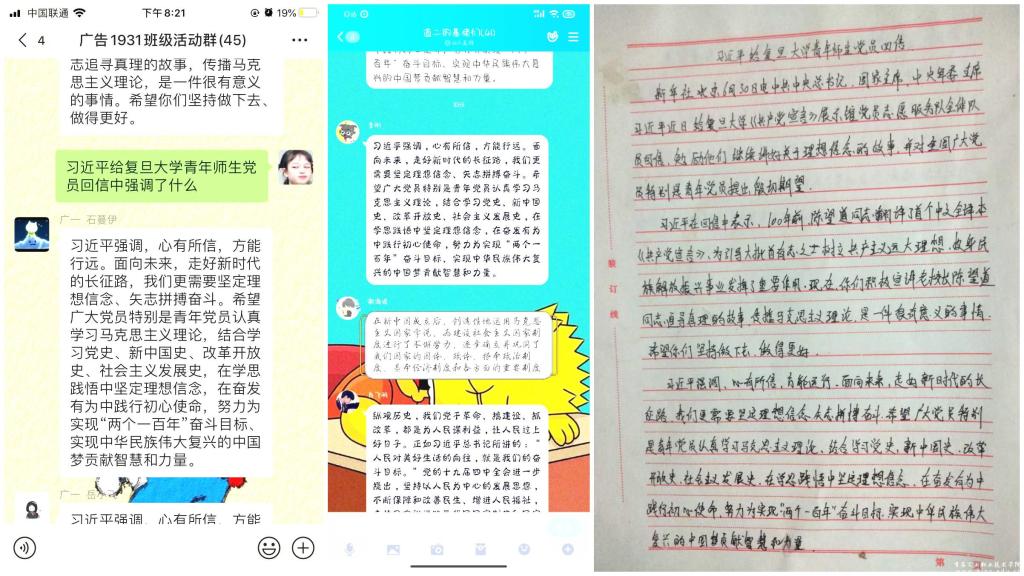 7月1日,在纪念建党99周年的特殊日子,我校各团支部、校学生会、学生社团、1231工程学生(青马工程)等学生群体组织采用学回信、写感悟、重温誓词、唱红歌等多种形式为党的生日献礼。通过线上线下两种方式重点学习“习近平总书记给复旦大学青年师生党员回信”精神,同学们作出积极响应。