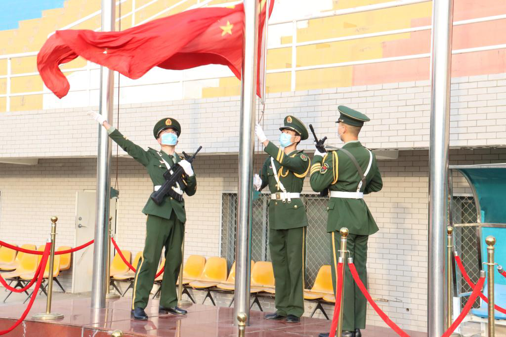 仪式上,国旗护卫队扛旗在肩,迈着坚定有力的步伐走向升旗台;师生高唱国歌,注视着五星红旗冉冉升起,飘扬在校园上空。在特殊时期,这一幕让人更加激动、非比寻常。
