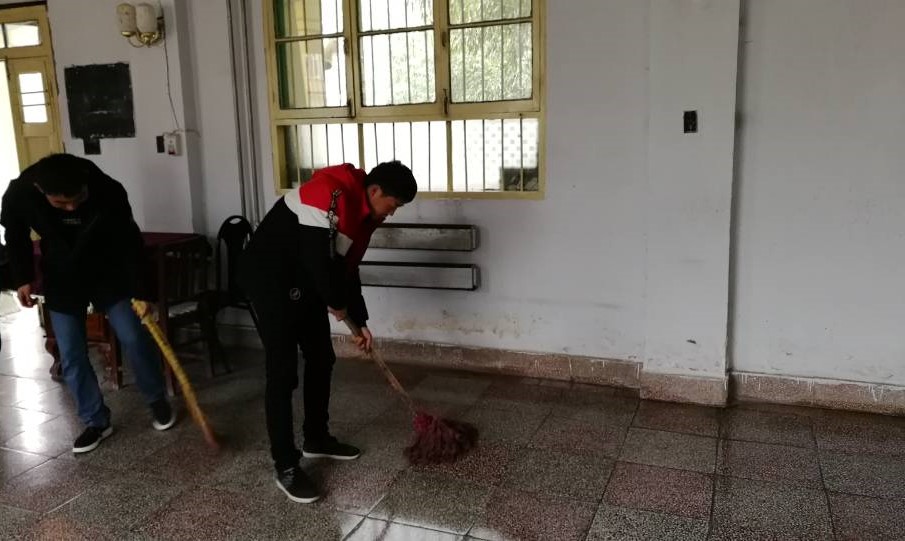 中午12点团总支成员在一教楼前集合,带着打扫卫生的工具满怀激情的走向了位于学校生活区的老年活动中心,帮助管理员打扫卫生,并打扫了活动室周围的道路及环境卫生,经过大家的一番劳动校老年活动中心整体面貌焕然一新。